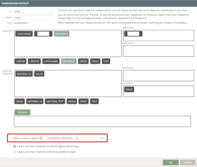 For the Composition Output, there is one extra setting once you placed a checkmark next to the option 'Show in custom report'. This is useful when using the material option 'Value'. The extra setting allows you to decide how many digits of the value should be displayed after the comma.