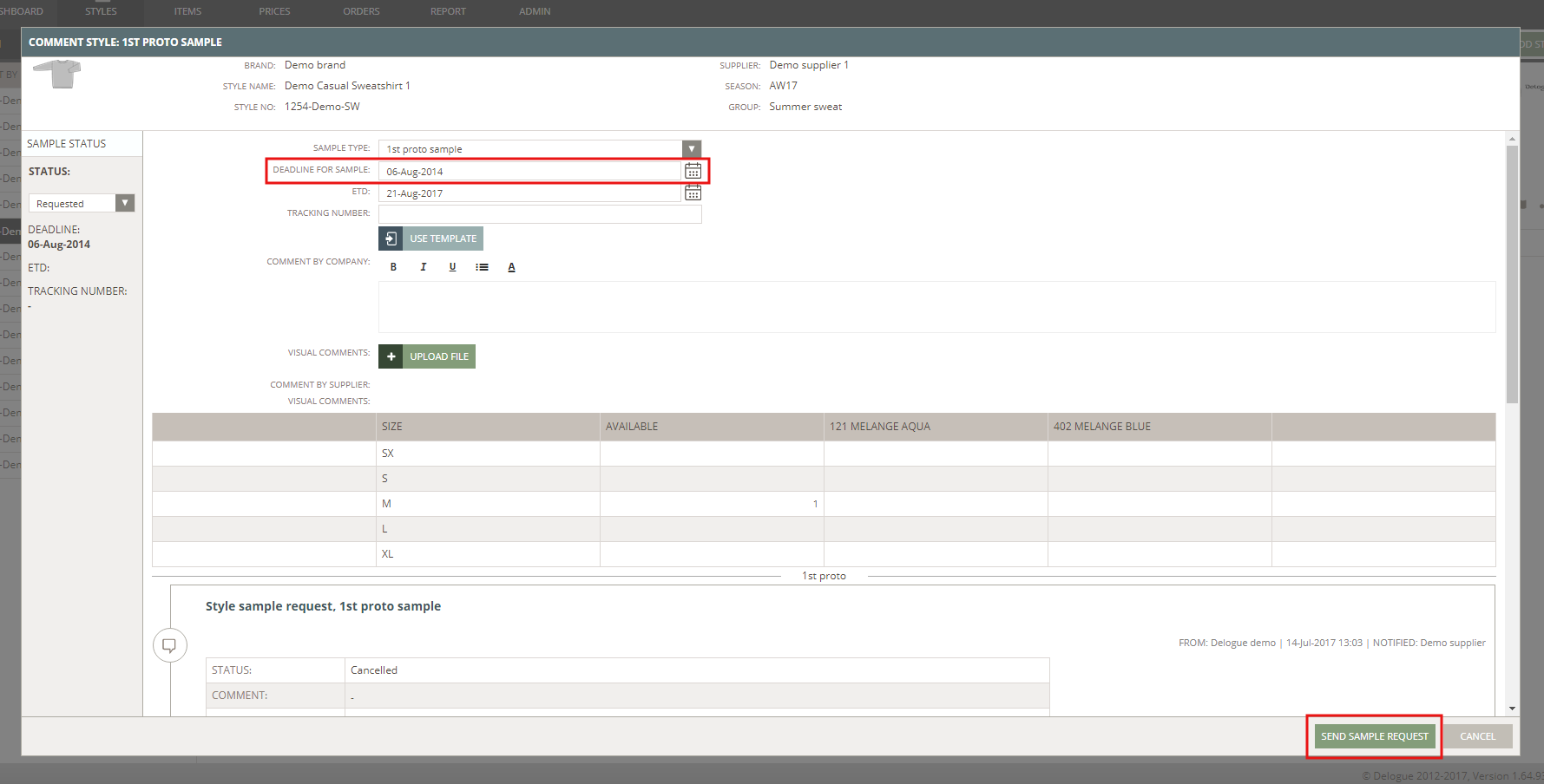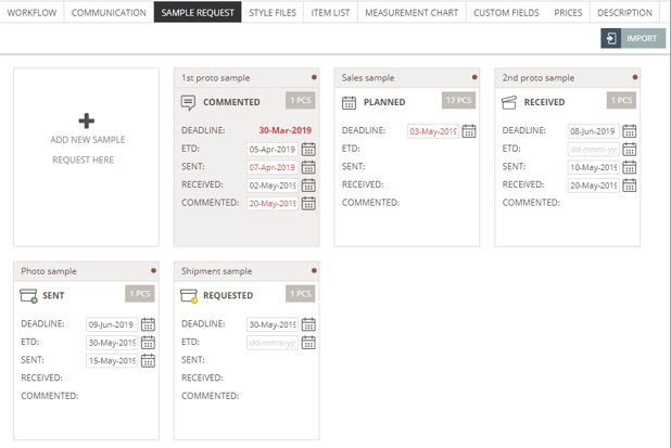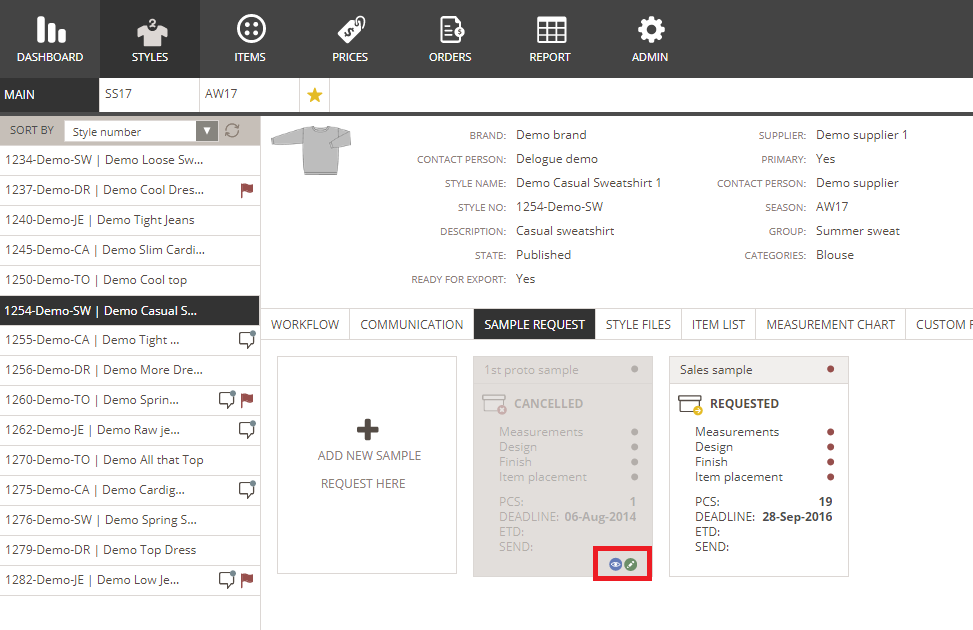 In the style sub-tab 'Sample Requests' you will be able to find all your style specific sample requests shown as sample cards.