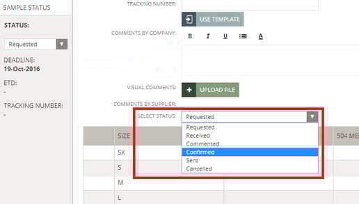 Once a sample has been requested by the brand, you are able to confirm that you have received the request by changing the state from 'Requested' to 'Confirmed'. You can also fill in an ETD of when you expect to send the sample.