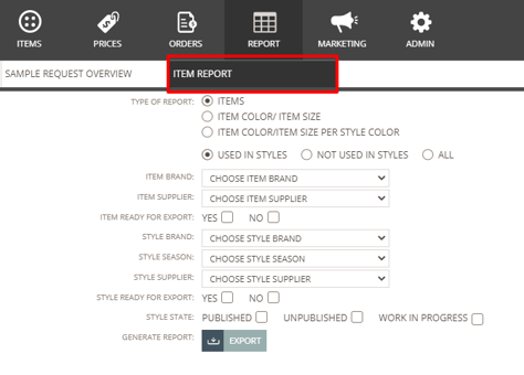 In the Item Report you and your suppliers can get a complete overview of all your items. Choose how the report should be exported and an email will be sent to you with the excel sheet of the item report.