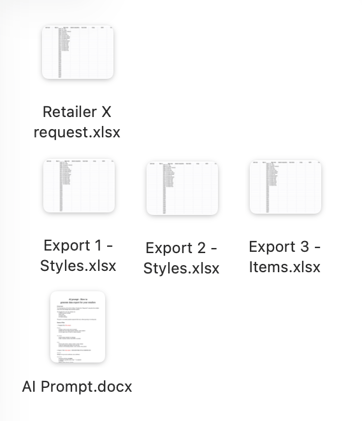 You should now have at least one (potentially two) Style exports, one Item export, your retailers request and the AI prompt document downloaded: