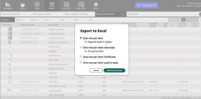 3. Once the report contains all the information, but only the information needed, click Export to Excel and choose the exporting option ‘One row per Item’. Make sure ‘Expand Used in Styles’ is ticked on as well. This is the key setting: It links each item to the belonging style(s), which is important information so that the AI tool can link the items to the styles.