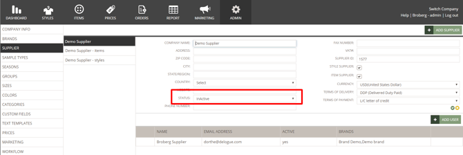 NOTE: The deactivation will not affect styles and items connected to the supplier. For transparency reasons, a Supplier Company can only be deactivated, not deleted.