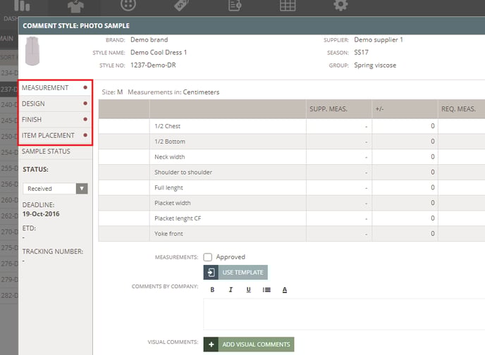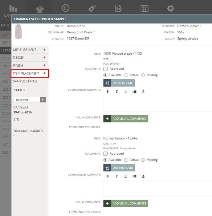3. Add relevant comments and visual comments for each of the comment fields in the sample request. For 'Item placement', your supplier can also mark if the item is available or missing.