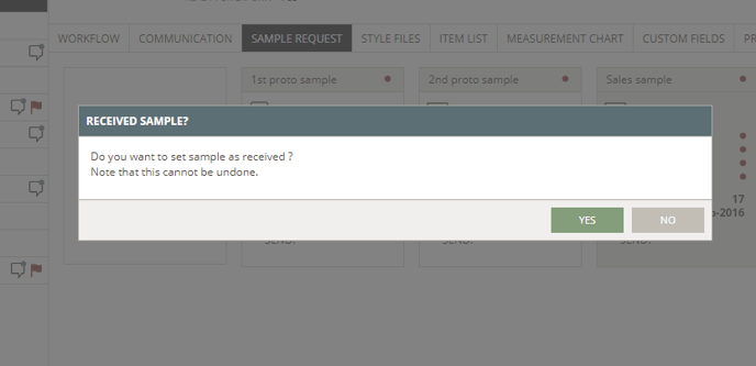 Once a sample has been requested, your supplier is able to confirm it by changing the state from 'Requested' to 'Confirmed'. The supplier can also fill in an ETD of when he expects to send the sample.