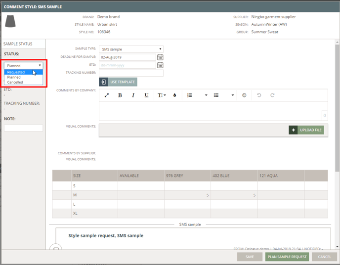 Planned | Sample is not requested yet. Planned is used to inform supplier and book capacity. |